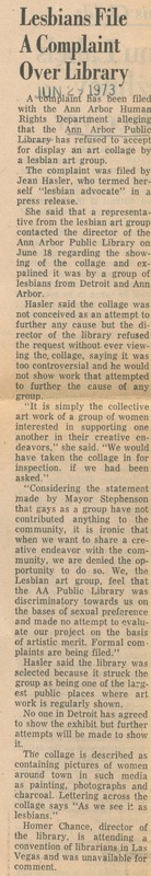 Article regarding the complaint Jean Hasler filed to the Ann Arbor Human Rights Department which alleged the Ann Arbor Public Library was discriminating against a group of lesbian artists because the library refused to display a collage they created.