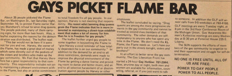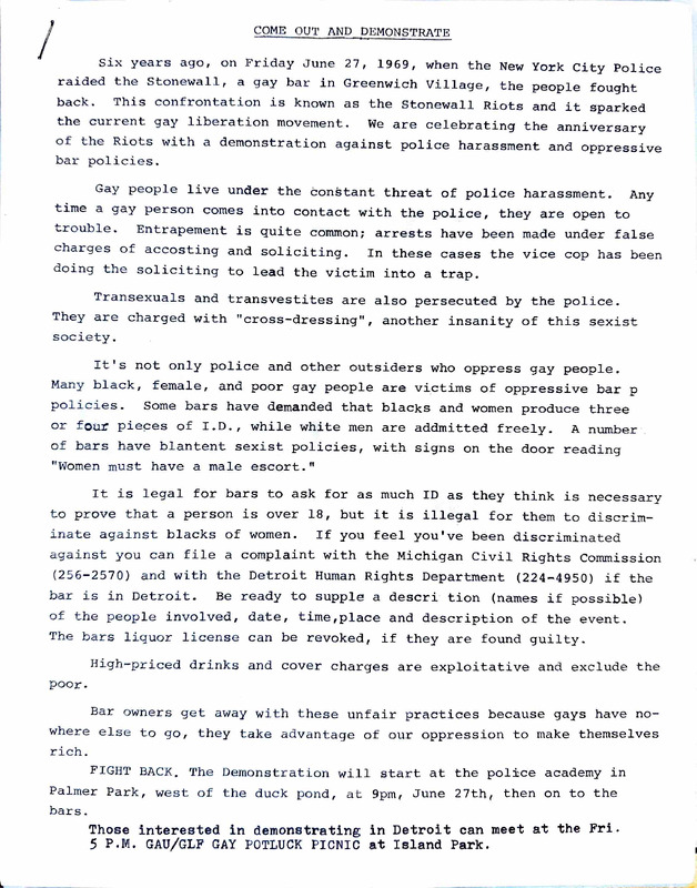 A message for a Friday night demonstration in Detroit to protest police harassment and oppressive bar practices, and and a Sunday Gay Pride Fair celebration (commemorating 6 years since Stonewall) in Highland Park, MI.