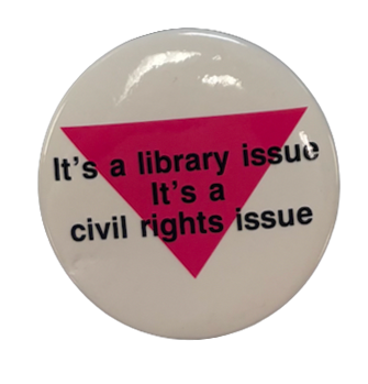 - One circular button that measures 2 inches diameter. It is composed of a metal disc covered in a protective layer of celluloid, and a pin backing. The face is white with an inverted pink triangle and black text that reads, "It's a library issue It's a civil rights issue."