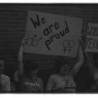 - Attendees of an event being held during pride week in 1975 are holding up signs that say "We are proud" and "Women's Revolution"