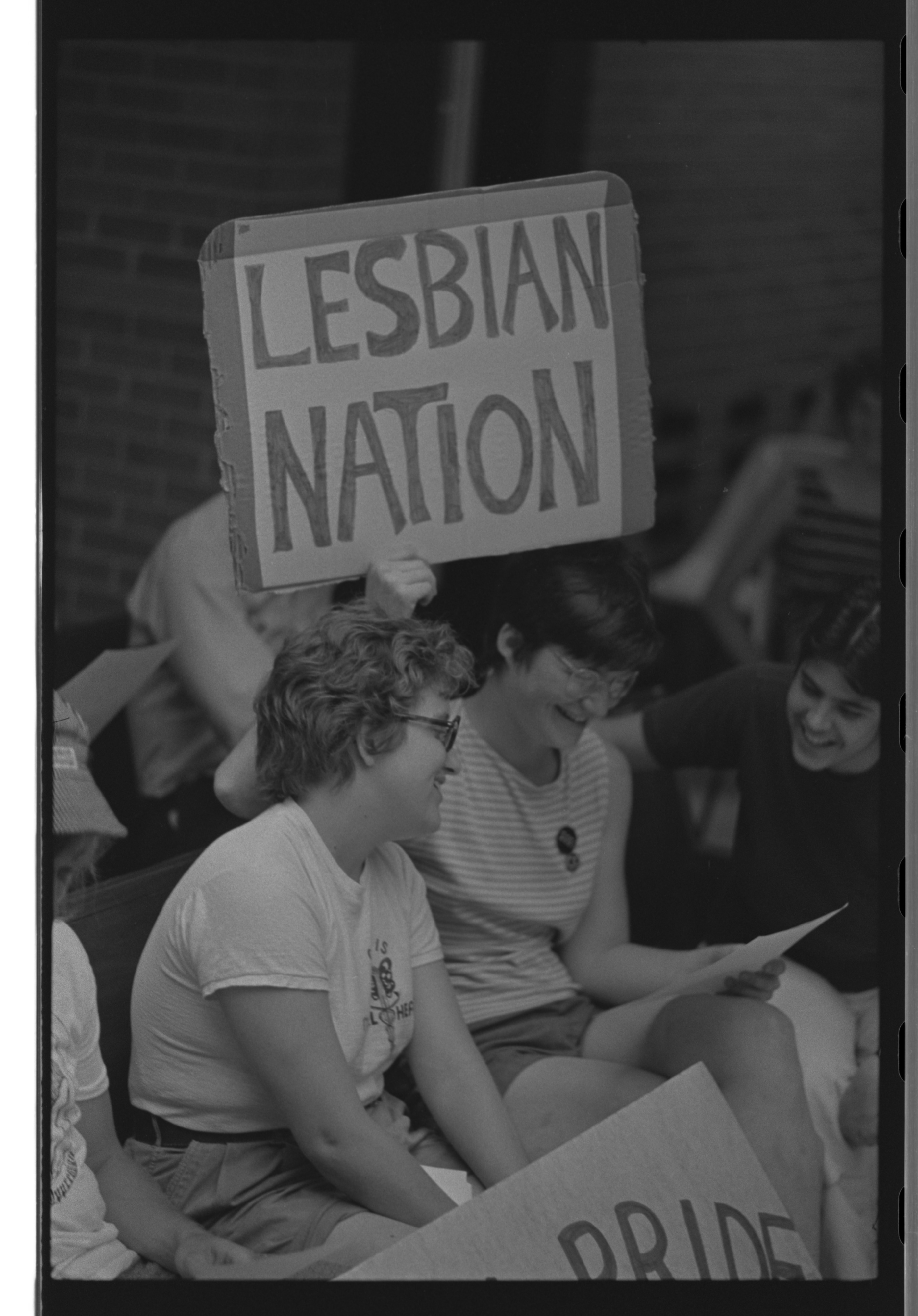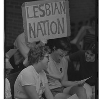 - Attendee of an event being held during pride week in 1975 is holding a sign reading "Lesbian Nation"