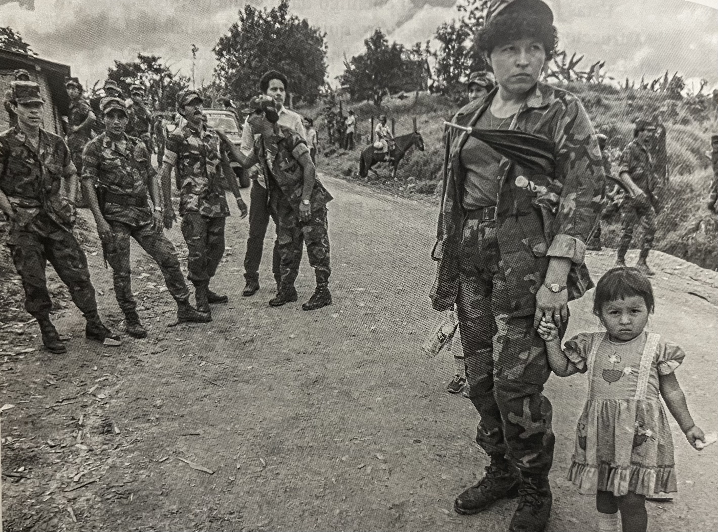 A young woman dressed in military uniform holding the hand of her daughter. Behind her, more soldiers in what appears a training camp or a military station.