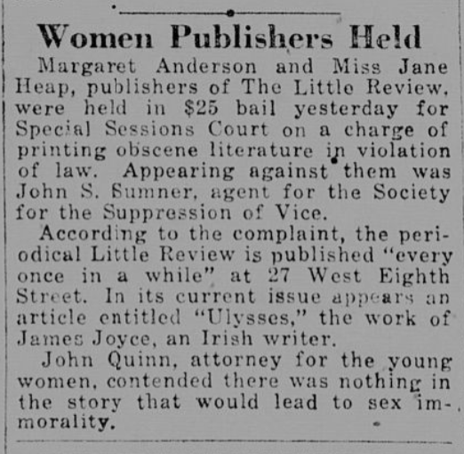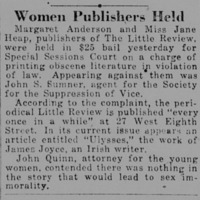 - An article which was published in the New York Tribune detailing Margaret C. Anderson and Jane Heap being held on $25 bail for publishing lewd content in their magazine.