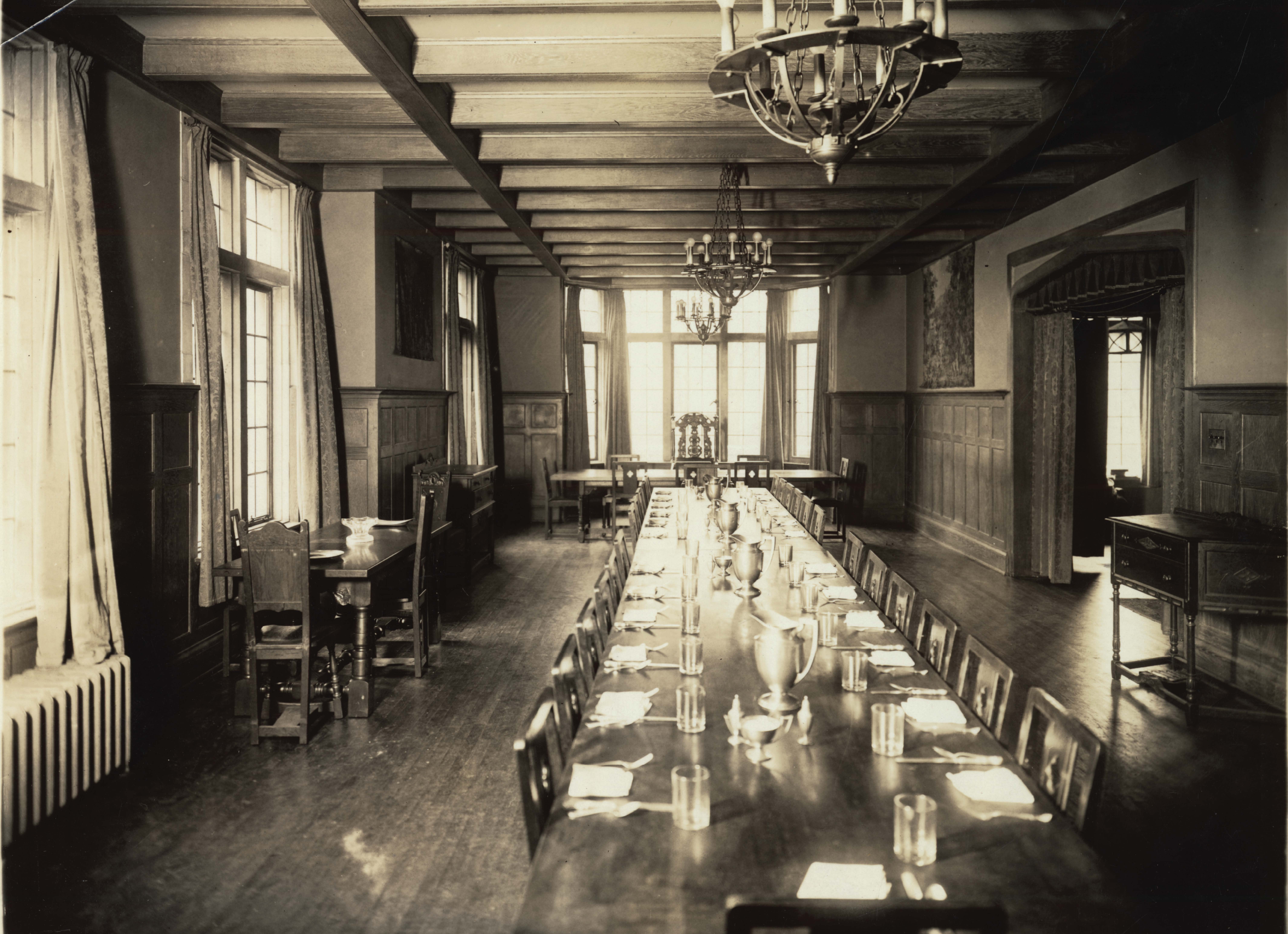 - (1930 (ca.)) Dining room (taken from kitchen) arch to hall at right, visitors table at left. At long table, freshmen sat nearest the kitchen, Theta Delta Chi. Retrieved from the Digital Public Library of America, http://name.umdl.umich.edu/IC-BHL-X-HS9489%5DHS9489