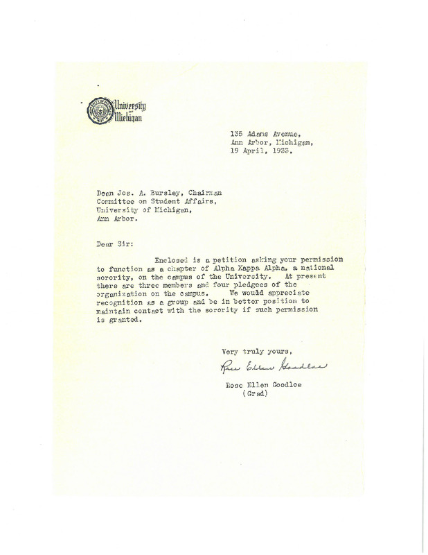 The Beta Eta chapter of Alpha Kappa Alpha was chartered at the University of Michigan on June 3rd, 1933. Five young Black women, Ruth Birch, Viola Goin, Mable James, Adele Jones, and Olive Manly, came together in the hopes of making the college experience valuable and meaningful by starting this chapter (Alpha Kappa Alpha Sorority Inc., Beta Eta Chapter, n.d.).